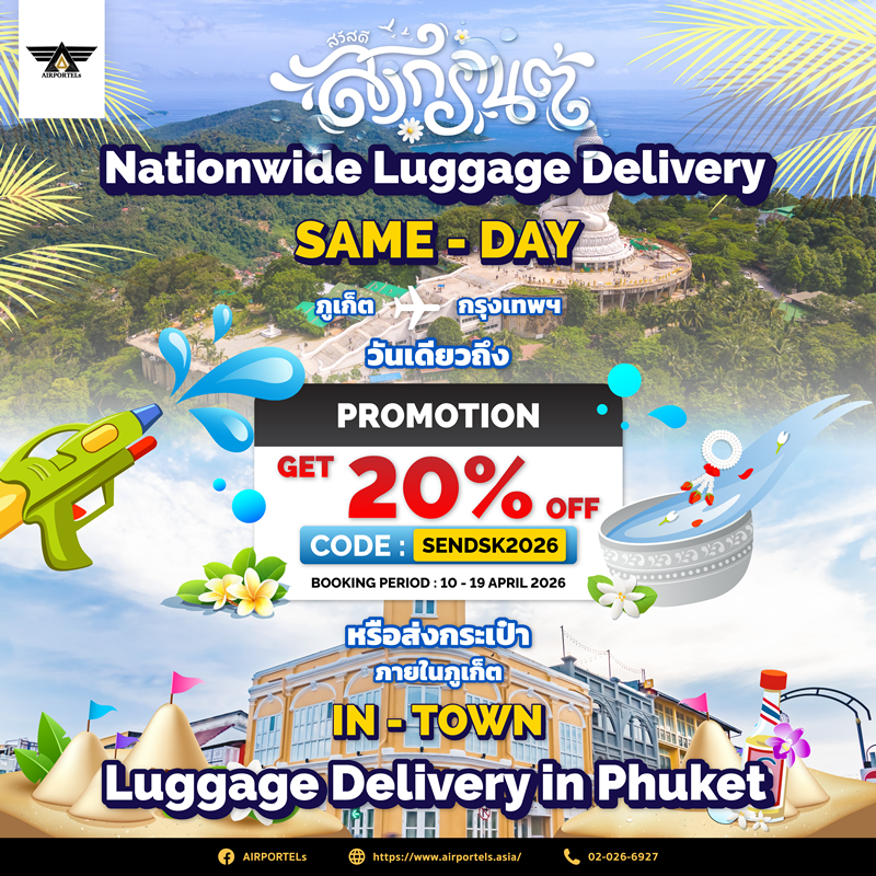 เที่ยวสาดน้ำให้สุด ตัวเบาตลอดเทศกาลสงกรานต์นี้ AIRPORTELs ส่งกระเป๋าถึงที่พักวันเดียว ทั้งในจังหวัดและระหว่างภูเก็ต–กรุงเทพฯ พร้อมส่วนลดพิเศษสูงสุด 20% ...