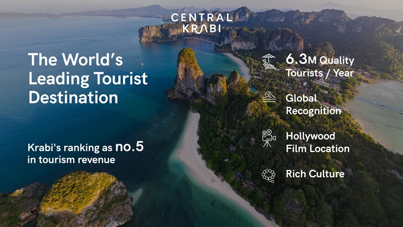 เซ็นทรัล กระบี่ ออกแบบด้วย Landscape Architecture ที่เคารพต่อธรรมชาติและทัศนียภาพของเมือง โดยไม่สร้างตึกสูงบดบังทิวทัศน์ แต่ผสานอาคารเข้ากับภูมิทัศน์รอบข้างอย่างกลมกลืนแรงบันดาลใจมาจากเอกลักษณ์ของกระบี่ ทั้งหมู่เกาะที่งดงาม โดยอาคารแต่ละหลังถูกดีไซนให้เสมือนเกาะเล็ก ๆ เรียงรายกลางทะเล เพดานตกแต่งด้วยเส้นสายโค้งคล้ายใบปาล์มสร้างบรรยากาศร่มรื่นราวกับเดินอยู่ท่ามกลางสวนปาล์มและส่วนหลังคาโค้งลดหลั่น สื่อถึงภาพเรือหัวโทงที่เรียงรายตามชายหาด ขณะที่ป้ายโฆษณาและสื่อต่าง ๆ ถูกออกแบบให้กลมกลืนกับธรรมชาติรอบข้าง อีกหนึ่งไฮไลต์คือการเปิดตัว Mascot “ปูดำ” สัญลักษณ์สำคัญสื่อถึงความอุดมสมบูรณ์ของเมืองกระบี่ ที่ให้ทุกคนมีส่วนร่วมตั้งชื่อเพื่อฉลองอัตลักษณ์ท้องถิ่นอย่างภาคภูมิ Tourist Destination Hub กระบี่มีศักยภาพก้าวสู่การเป็น “Tourism Powerhouse of Andaman” เมืองท่องเที่ยวคุณภาพสร้างรายุได้ติด Top 5 ของประเทศ ไม่รวมกรุงเทพฯ* (อันดับ 1 ภูเก็ต, 2 ชลบุรี, 3 สุราษฎร์ธานี, 4 เชียงใหม่ และ 5 กระบี่) และ Top 3 ของภาคใต้